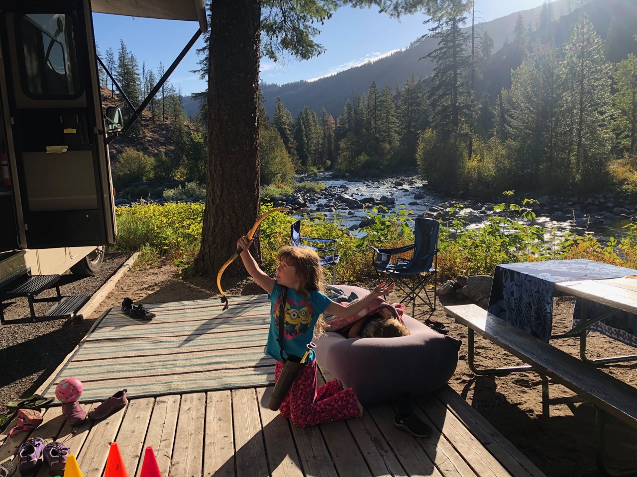 And then in the evening we decided to set up a mini-soccer field using some cones and play a family soccer game. How have we not done this before now? This was exactly the type of scene I envisioned when I imagined our journey at its most ideal – the whole family heading back sweaty and laughing to our RV by the rushing river in the mountains, having been forced to end our soccer game because it got too dark to see.